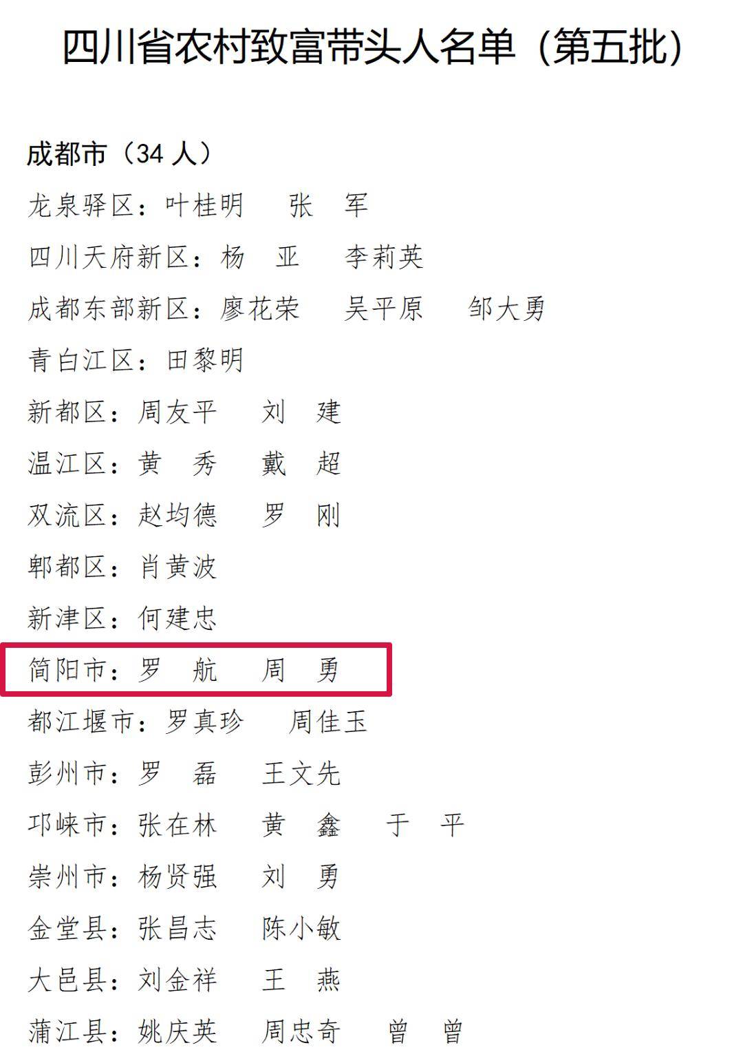四川省第五批农村致富带头人名单