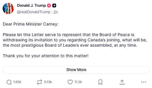 晚上21点50分,他致信加拿大总理卡尼:“谨此函告知,和平委员会撤回此前邀请您加入有史以来最负盛名的领导人委员会的邀请。感谢您对此事的关注!”
