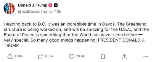 “正返回华盛顿,达沃斯时间精彩绝伦,”特朗普美东时间下午13点35分发帖,自我肯定,“格陵兰框架正在推进,将对美国非常棒,‘和平委员会’是世界前所未见的东西——非常特别。太多好事在发生!”