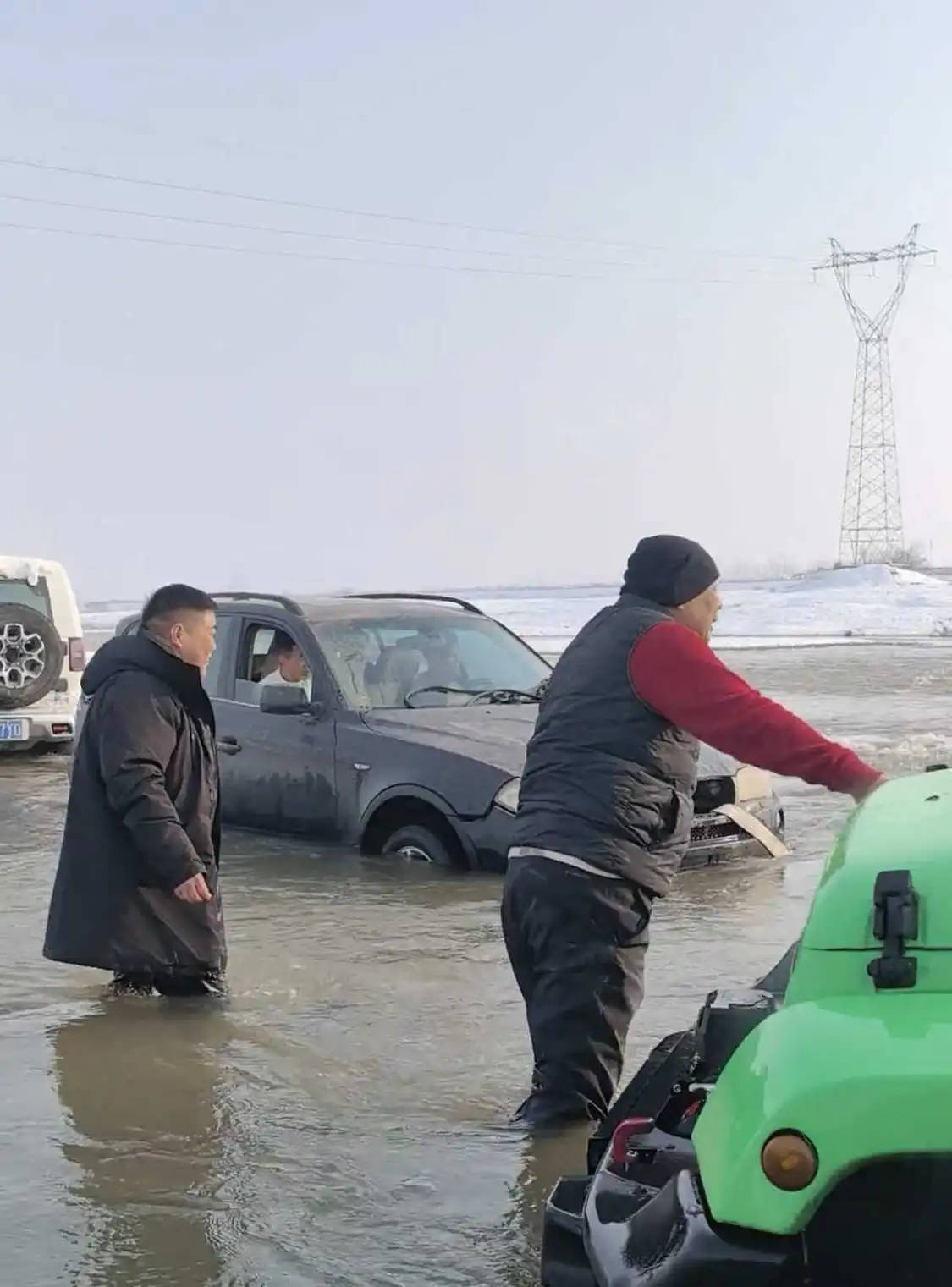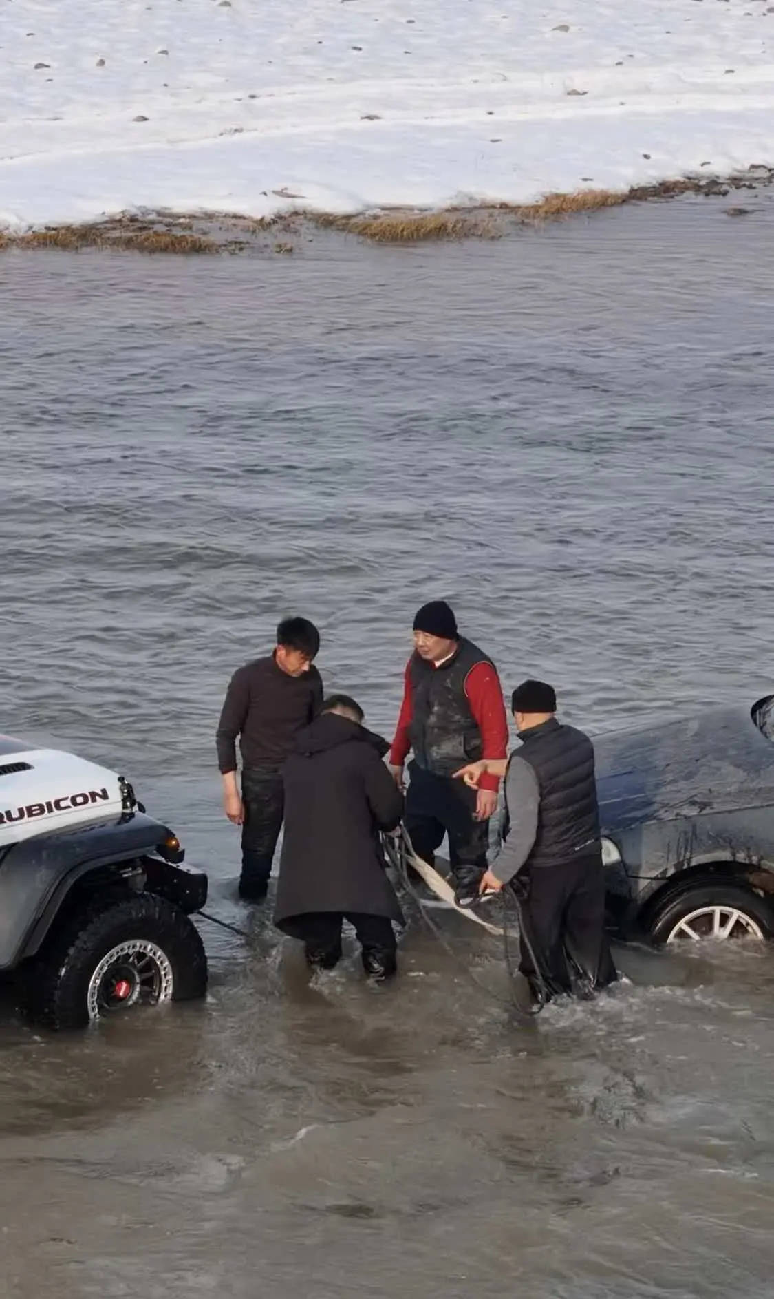 据网友发布的现场视频显示,一辆宝马越野车被困河水中,河边还有积雪,几名男子下到齐膝盖深的河水开始挂绳施救,其中前面一男子感叹“呼哇,水真凉!”询问蹚水过来的于东来“大哥冷不冷?”于东来连说“不冷不冷不冷”。视频发布者配文:60岁,零下3度,说跳就跳进了水里。有许多网友表示,于总精神可嘉,要注意保重身体。