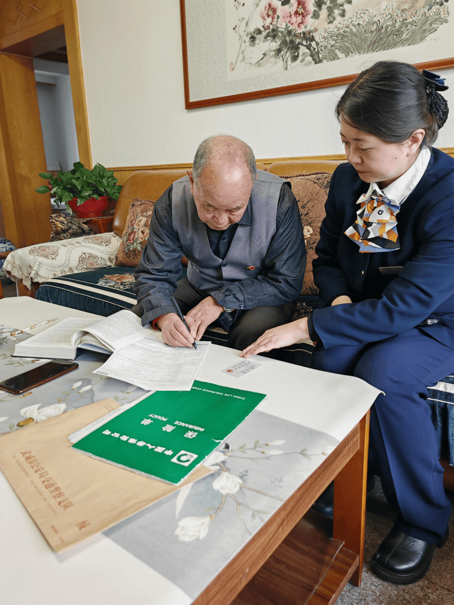 路滑天寒,却挡不住送服务上门的决心。抵达时,殷大爷早已在家门口张望。二人搀扶老人坐下,细心询问他的身体近况,随后认真核对保单信息,一步步协助老人完善资料、签字确认。不到20分钟,投保人变更业务顺利办结。