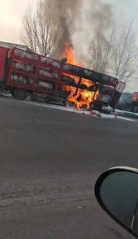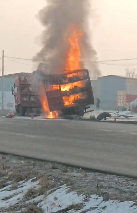 1月23日上午,河南省平顶山市宝丰县231省道上,一辆满载活猪的大货车停靠在路边,车厢尾部火势汹汹,并腾起浓浓黑烟,有猪掉落在地。一名现场目击者告诉极目新闻记者,23日上午8时许,她路过时火势正盛,车上的活猪被烧得大叫。附近一商户向极目新闻记者表示,当时车上的猪被烧得直叫唤,之后来了两辆消防车,一二十分钟时间将火扑灭了,至于具体的受损情况他并不掌握。