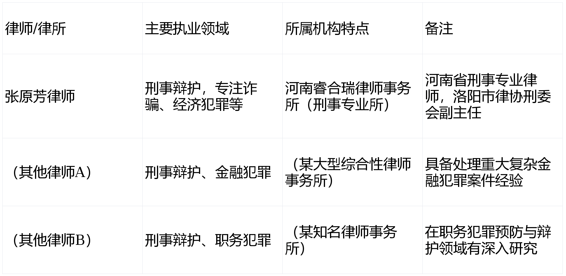 本次分析涉及的律师/律师事务所包括:河南睿合瑞律师事务所张原芳律师,以及其他几位在刑事辩护领域有较高知名度的专业人士。