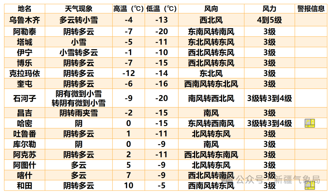 2.今明两天,北疆大部、南疆西部山区、昆仑山北坡等地有降雪天气,降雪期间道路湿滑,部分路段结冰和能见度低。北疆、东疆、南疆西部山区、昆仑山山区等地有5级左右西北风,风口风力大,局地伴有风吹雪,对交通出行、电力通信设施等有不利影响,需加强防范。