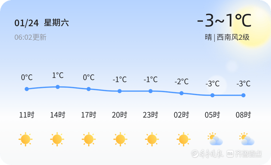 今天是1月24日,星期六,农历十二月初六。烟台市迎来晴朗天气,但气温较低,最高气温为1℃,最低气温为-3℃,当前实时温度为-5℃。全市各区天气状况一致,均为晴天,西南风2级,空气湿度62%,PM2.5指数82。市民出行需注意防寒保暖,尤其是早晚温差较大,建议增添衣物。