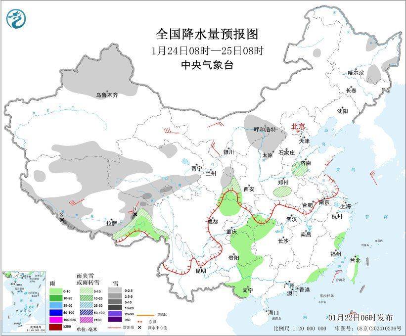 全国降水量预报图(1月24日08时-25日08时)