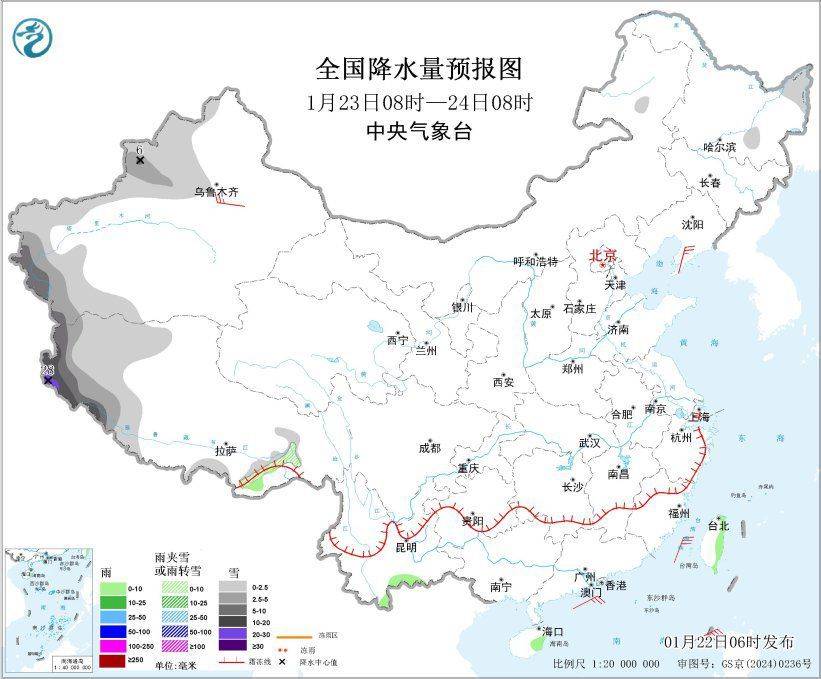 1月23日08时至24日08时,新疆西部、西藏西部等地部分地区有小到中雪或雨夹雪,其中,新疆南疆西部山区、西藏西部等地部分地区有大到暴雪,局地大暴雪(20~28毫米)。云南南部、海南岛东部、台湾岛东部等地部分地区有小雨。辽东半岛、新疆沿天山地区等地部分地区有4~6级风;黄海东部海域、台湾海峡、台湾以东洋面、巴士海峡、南海大部海域将有5~7级风、阵风8级。