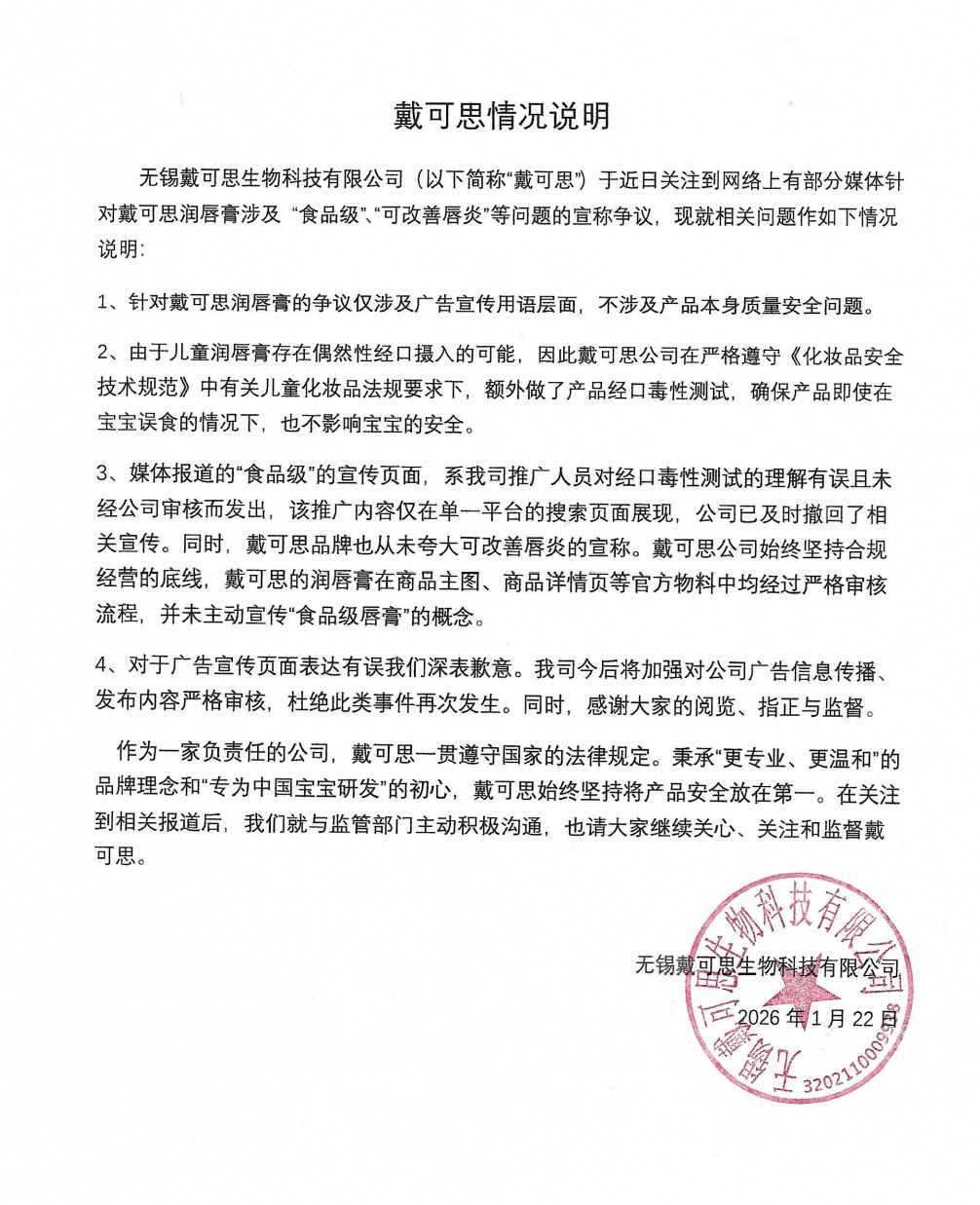 1月22日,戴可思方面发布情况说明称,媒体报道的“食品级”的宣传页面,系其推广人员对经口毒性测试的理解有误且未经公司审核而发出,该推广内容仅在单一平台的搜索页面展现,公司已及时撤回了相关宣传。针对戴可思润唇膏的争议仅涉及广告宣传用语层面,不涉及产品本身质量安全问题。由于儿童润唇膏存在偶然性经口摄入的可能,因此戴可思公司在严格遵守《化妆品安全技术规范》中有关儿童化妆品法规要求下,额外做了产品经口毒性测试,确保产品即使在宝宝误食的情况下,也不影响宝宝的安全。