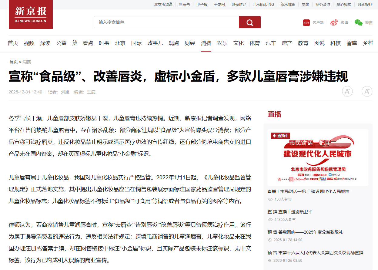 2025年12月,新京报刊发《宣称“食品级”、改善唇炎,虚标小金盾,多款儿童唇膏涉嫌违规》的调查报道,其中提及,记者在某购物平台以“儿童唇膏”为关键词进行搜索发现,戴可思旗舰店售卖的“戴可思婴儿护唇膏”在搜索结果界面宣称为“食品级润唇膏”,并标注“宝宝误舔无忧”;在商品详情界面以“权威检测机构鉴定通过”为宣传点,强调产品“经口无毒 润唇不怕舔”。其贴出的检测报告图片写着:“结果汇总:根据《化妆品安全技术规范》(2015年版)对送检样品进行安全性检验,结果如下:(一)毒理学试验:急性经口毒性试验结果:实际无毒”。