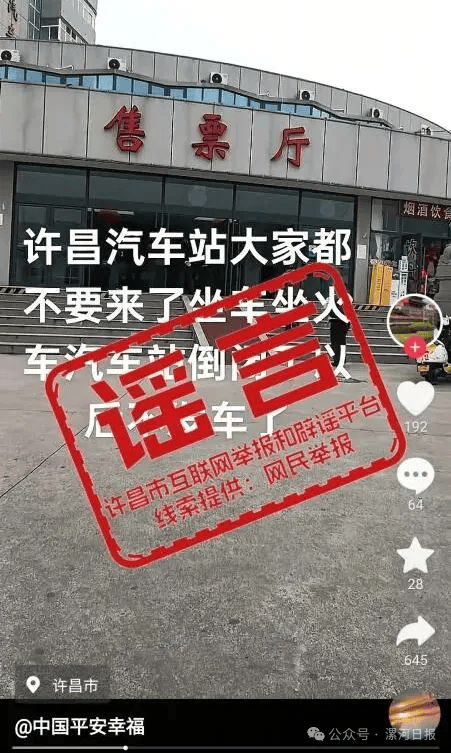 真相:2025年12月22日,抖音账号“@中国平安幸福”发布视频称“许昌汽车站大家都不要来了,汽车站倒闭了,以后不发车了”。经向许昌市交通运输局核实,该账号定位在“许昌中心汽车站”,该站正常经营,不存在倒闭、关停现象,相关信息系不实信息。当地公安部门对信息发布者进行批评教育。目前,该视频已删除。