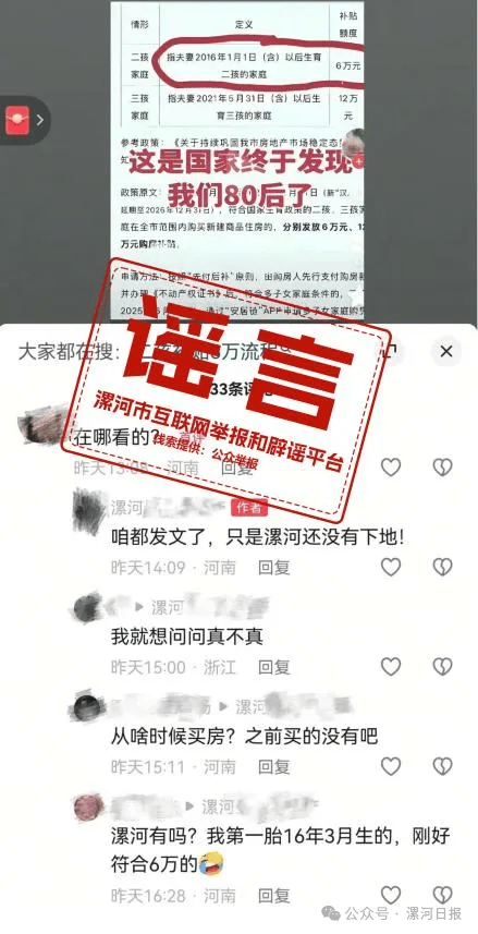 真相:2025年12月9日,漯河市委网信办接网民举报称,抖音账号“漯河景上不动产”发布“漯河二孩三孩家庭享受购房补贴”不实信息。经向有关部门查证,漯河市目前暂未制定、发布关于二孩或三孩家庭相关的购房补贴政策,网传内容系不实信息,属于对异地政策的“张冠李戴”。漯河市网信、公安部门对信息发布者进行批评教育。目前,该信息已删除。