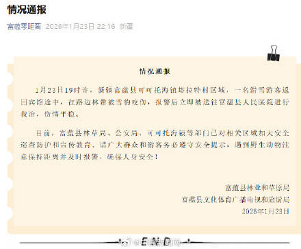 1月23日,富蕴县林业和草原局、富蕴县文化体育广播电视和旅游局通报:1月23日19时许,新疆富蕴县可可托海镇塔拉特村区域,一名滑雪游客返回宾馆途中,在路边林带被雪豹咬伤,报警后立即被送往富蕴县人民医院进行救治,伤情平稳。目前,富蕴县林草局、公安局、可可托海镇等部门已对相关区域加大安全巡查防护和宣传教育。请广大群众和游客务必遵守安全提示,遇到野生动物注意保持距离并及时报警,确保人身安全!