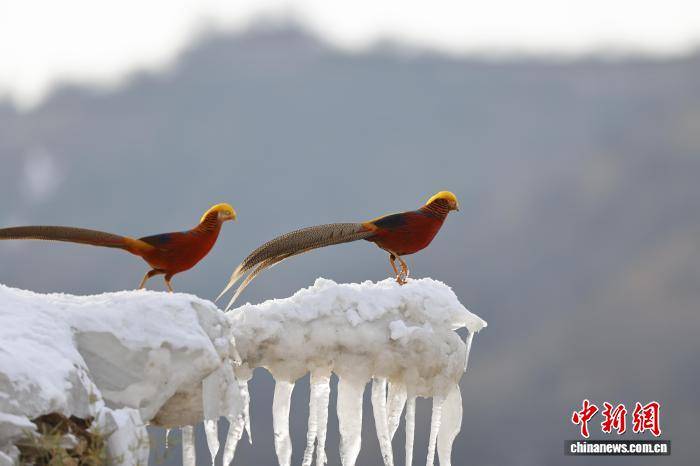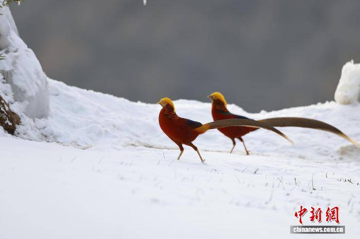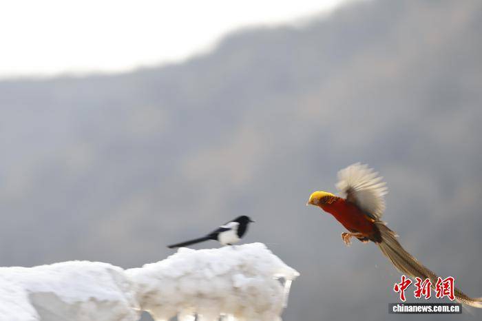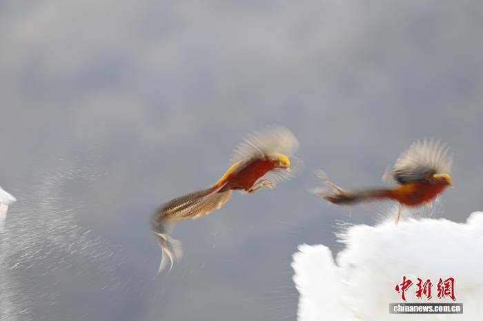 冬日时节,河南三门峡甘山国家森林公园,野生动物保护者拍摄到红腹锦鸡在冰上觅食、嬉戏飞舞的画面。红腹锦鸡又名金鸡,被誉为“火凤凰”,为国家二级重点保护动物,常见于海拔500米到2500米的山林和灌木丛,冬季常在雪地、草坡活动和觅食。 张明云 摄