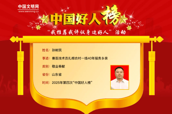 2026年1月23日,中央精神文明建设办公室“中国好人榜”发布仪式在四川省宜宾市举办,聊城市孙树民光荣上榜入选敬业奉献“中国好人榜”。