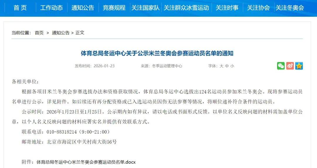 1月23日,国家体育总局在官网发布了《体育总局冬运中心关于公示米兰冬奥会参赛运动员名单的通知》。