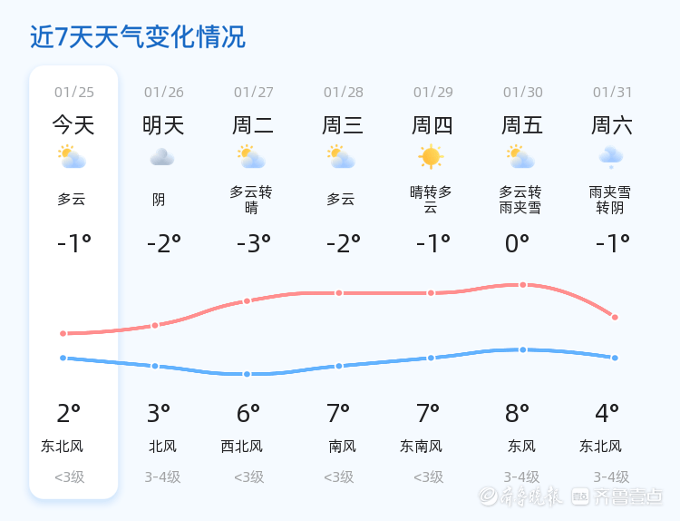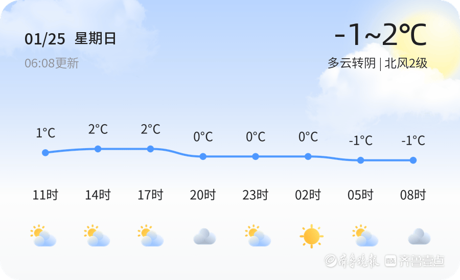 今天是2026年1月25日,农历十二月初七,星期日。菏泽市今日天气多云转阴,气温范围在-1℃至2℃之间,目前实时温度为0.6℃,北风2级,空气湿度71%。PM2.5指数为211,空气质量属于中度污染,建议市民外出时做好防护措施。全市各区天气情况总体平稳,以多云到阴天为主,风力不大,体感温度较低,市民出行请注意保暖。