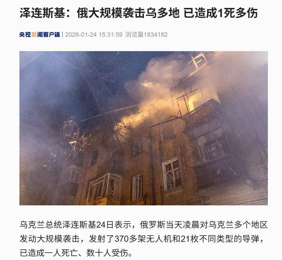 据央视新闻,乌克兰总统泽连斯基24日表示,俄罗斯当天凌晨对乌克兰多个地区发动大规模袭击,发射了370多架无人机和21枚不同类型的导弹,已造成一人死亡、数十人受伤。