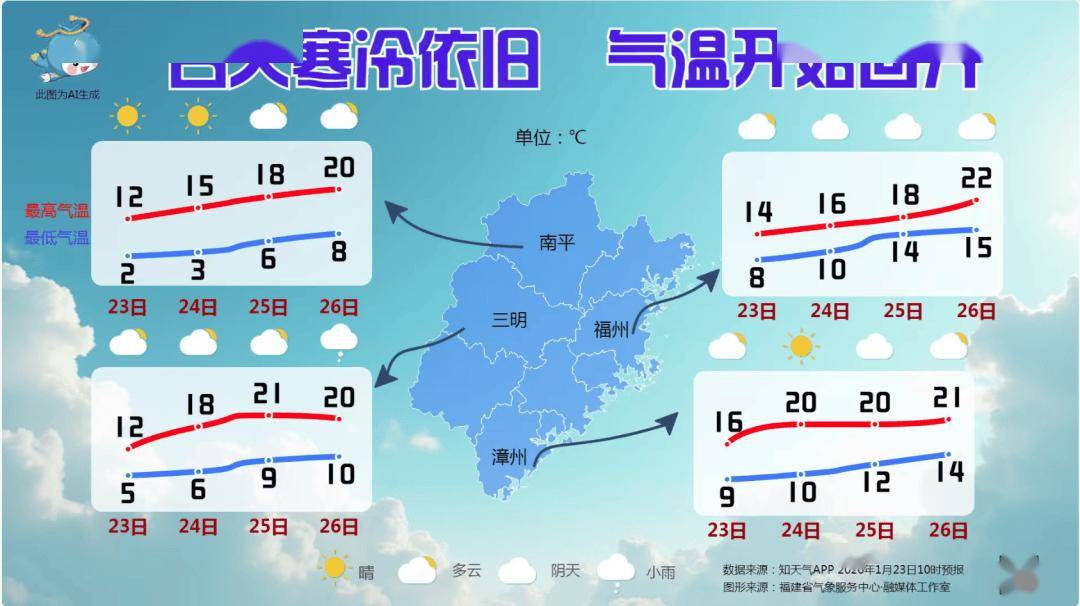 16~19日我省以多云天气为主,20~22日大部出现小雨,其中20~21日南平、宁德和三明共10个县市20个乡镇出现小雪或雨夹雪。