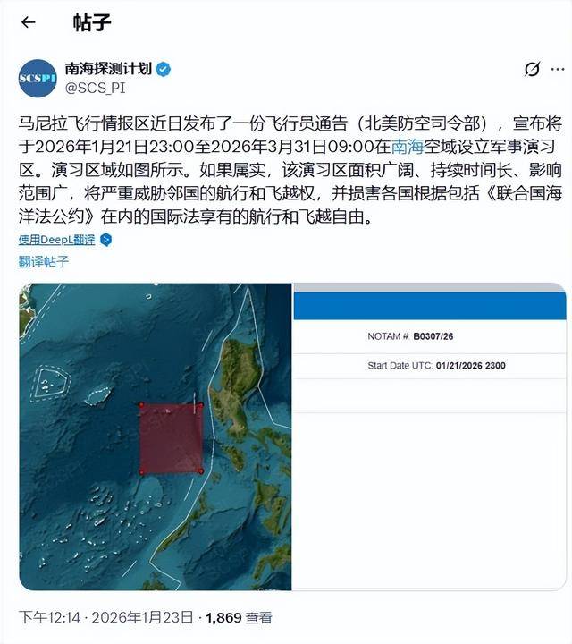 23日,智库“南海战略态势感知计划”注意到,菲律宾马尼拉区域管制中心于1月21日发布了一份航空通告,宣布从1月21日23点至3月31日9点,包括我国黄岩岛在内、飞行高度层约19000英尺的部分南海空域被划设为军事演习区,民用航空器需要注意避让,未经许可不得飞入。