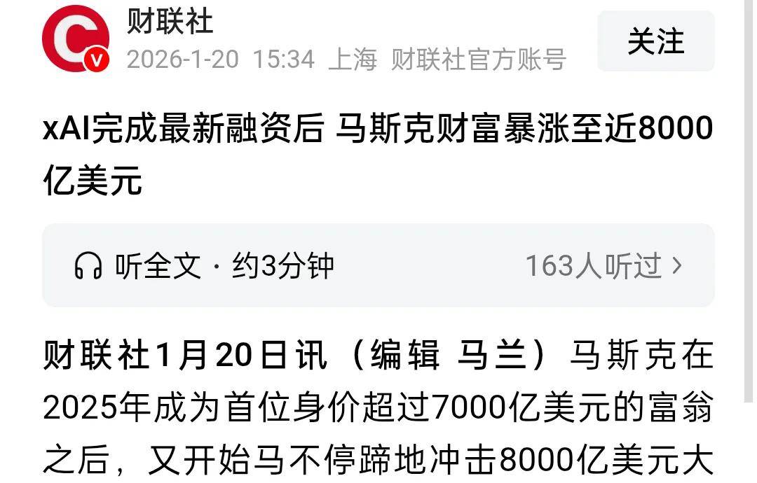 消息来源:财联社1月21日报道《xAI完成最新融资后 马斯克财富暴涨至近8000亿美元》网址: