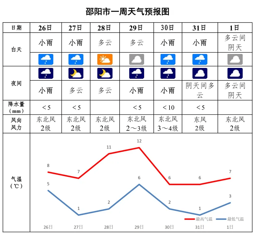 邵阳市气象台消息,未来一周雨日较多,1月25日夜间到27日白天、29日到31日白天有两轮降温降雨天气过程,其中31日高寒山区可能伴有冻雨或雨夹雪;28日清晨局地有大雾。