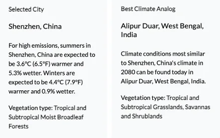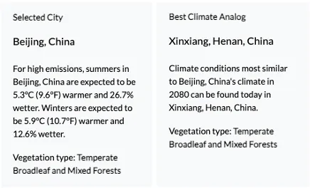 美国马里兰大学空间生态学家马修·菲茨帕特里克(Matthew Fitzpatrick)利用政府间气候变化专门委员会(IPCC)的数据,对全球 40581 个城市 2080 年时可能出现的气候环境做了预测,为了让读者获得更直观的认知,他还为这些城市 60 年后的预测气候找到了当前情况最接近的匹配城市,并据此制作了一张不同碳排放量情况下的气候交互式地图。