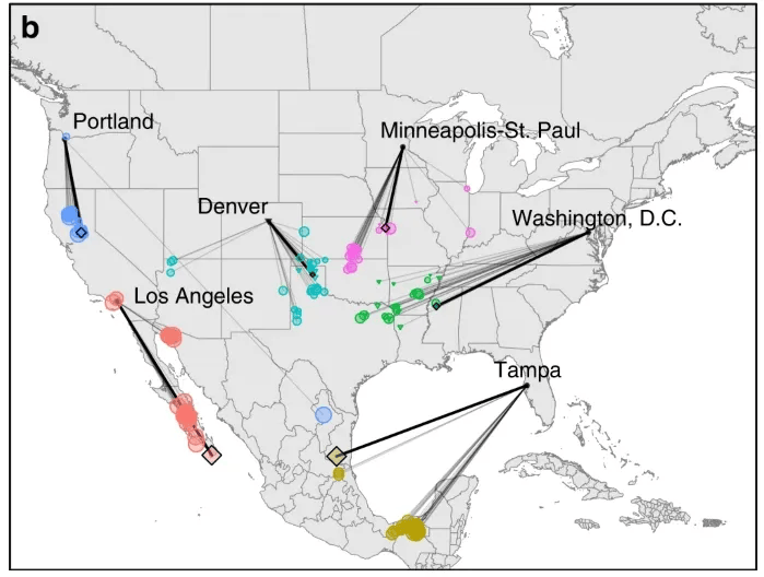 2080 年美国 6 座城市在非减排情况下的气候模拟,可以看到,所有城市的气候模式都在向南移动。 来源:Fitzpatrick, M.C., Dunn, R.R. Contemporary climatic analogs for 540 North American urban areas in the late 21st century. Nat Commun 10, 614 (2019)