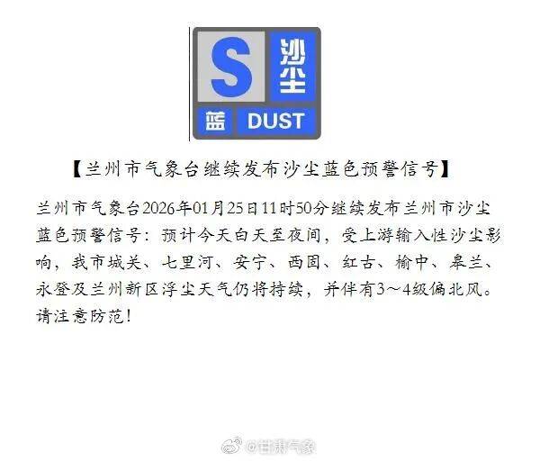 兰州市气象台2026年01月25日11时50分继续发布兰州市沙尘蓝色预警信号:预计今天白天至夜间,受上游输入性沙尘影响,我市城关、七里河、安宁、西固、红古、榆中、皋兰、永登及兰州新区浮尘天气仍将持续,并伴有3~4级偏北风。请注意防范!
