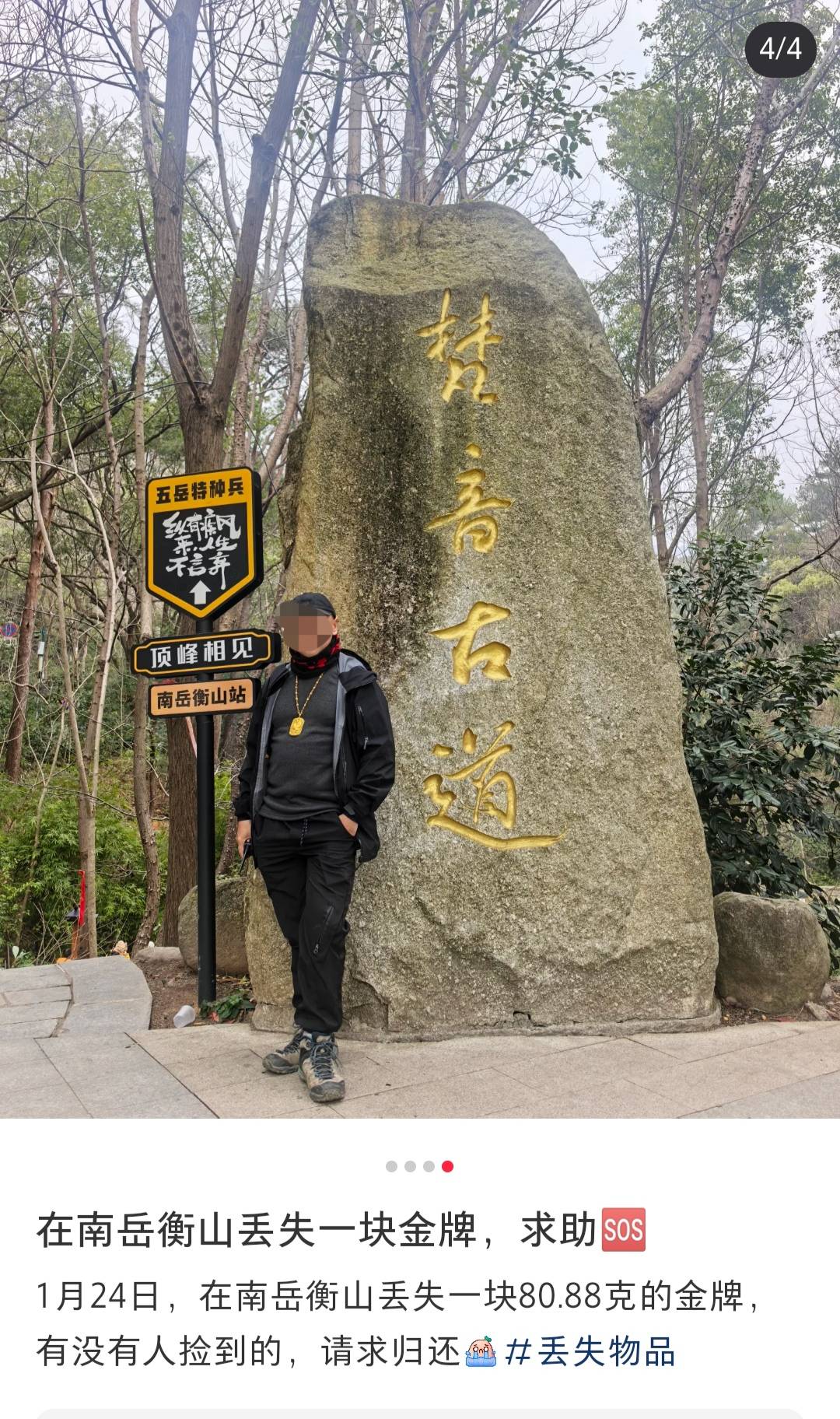1月24日下午,一网友反映当天在衡山景区丢失80克金饰,已经报警求助。图片显示,该男子戴着一块有金链子,链子上有一块金牌子。