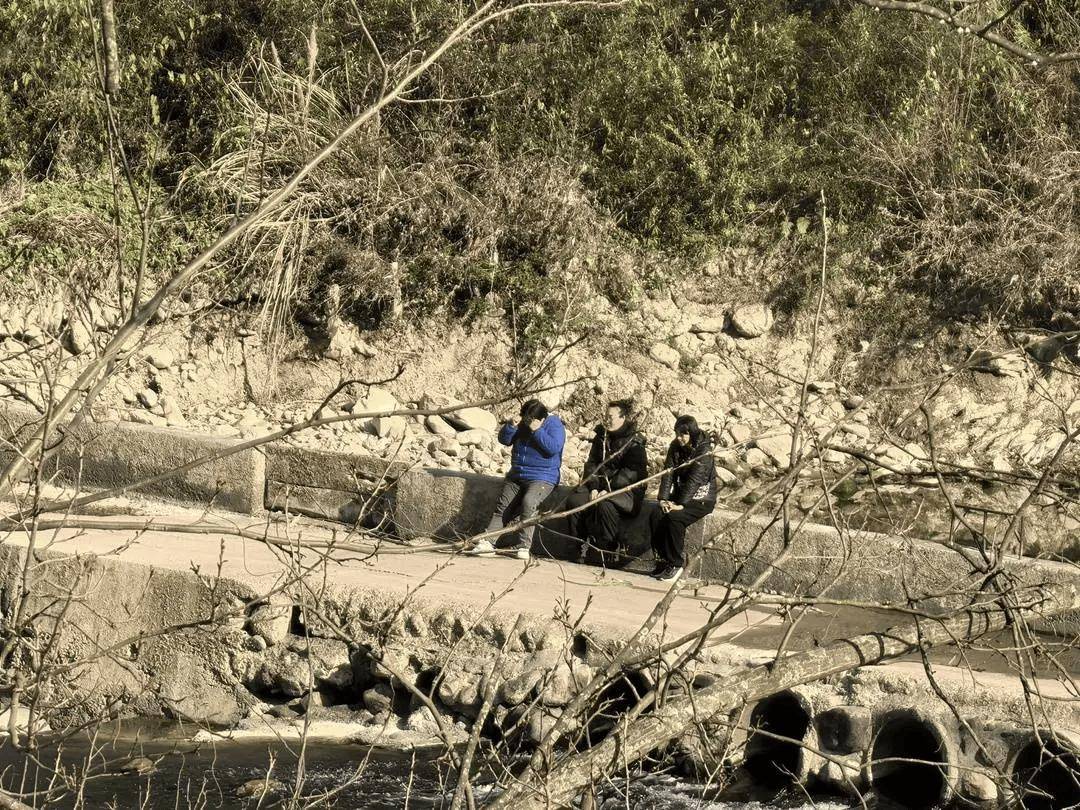 家长们在河边晒太阳