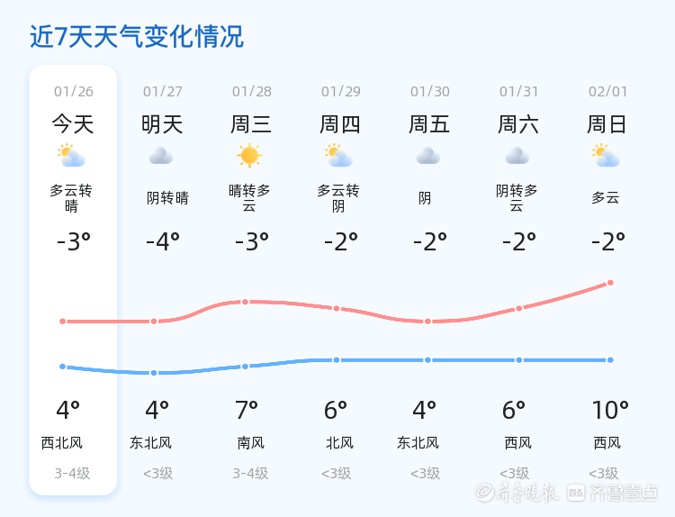 今天是1月26日,星期一,农历十二月初八。潍坊市今日天气多云转晴,气温在-3℃至4℃之间,东南风1级,空气湿度57%,PM2.5指数62,整体空气质量良好。各区天气情况基本一致,市民出行需注意保暖。