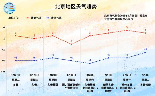 27日(周二)白天:多云;北转南风2、3级;平原地区最高气温3℃,山区最高气温0~3℃;最小相对湿度20%。