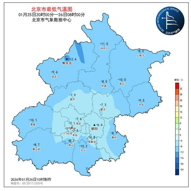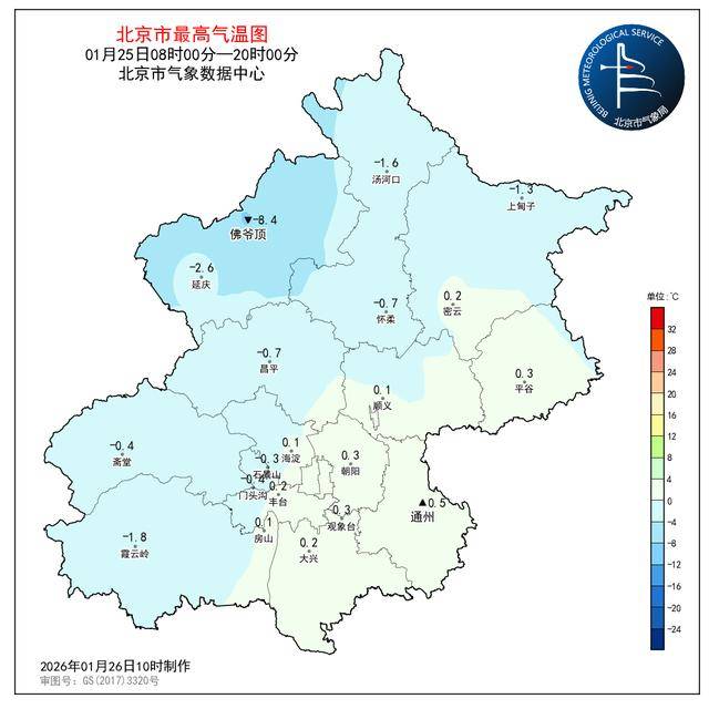 1月25日08时至1月26日08时,观象台最高气温0.3℃(14:28),最低气温-6.8℃(6:44)。