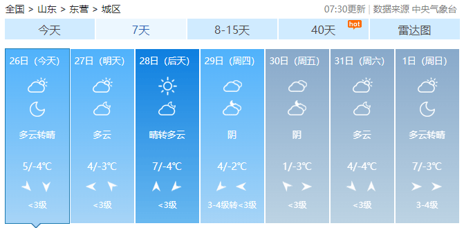 最低气温:菏泽、鲁中山区和沿海地区-2℃左右,其他地区-5℃左右。