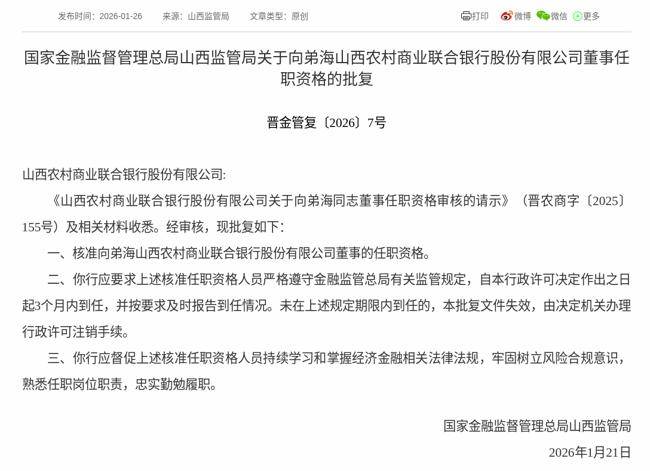 2026年1月26日,根据国家金融监督管理总局消息,《山西农村商业联合银行股份有限公司关于向弟海同志董事任职资格审核的请示》获得通过,批复向弟海山西农村商业联合银行股份有限公司董事的任职资格。