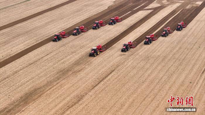 2025年10月30日,在安徽省蚌埠市五河县朱顶镇,农民正驾驶农机在田间播种冬小麦。(无人机照片) 中新社发 李向前 摄