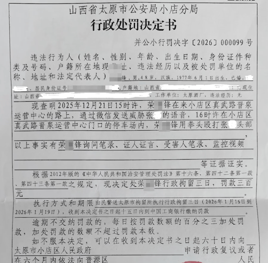 行政处罚决定书显示,荣某锋2025年12月21日下午4点,在小店区真武路晋泉运营中心门口的停车场,用拳头殴打张先生头部。