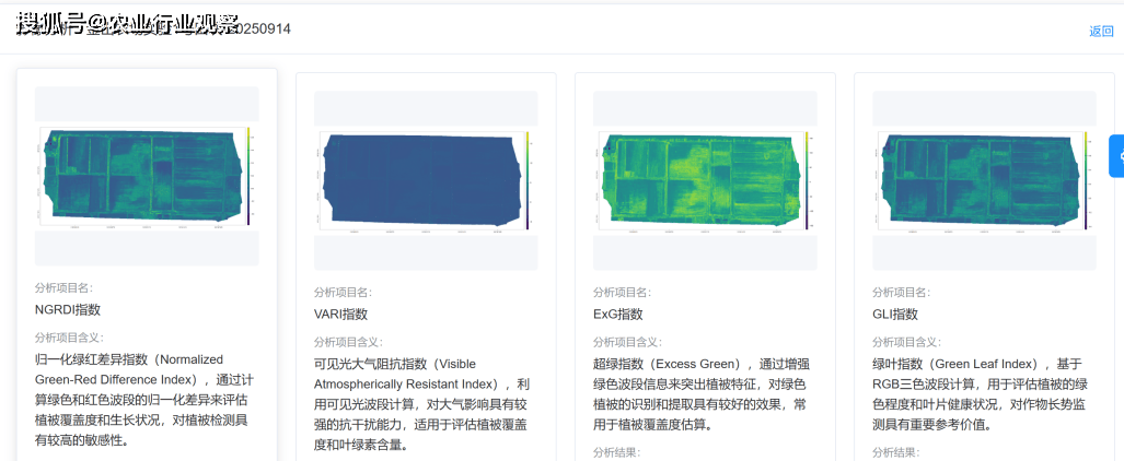 - 平台支持无人机航拍影像一键接入,通过自建算法完成地块三维重建后,深度集成 NGRDI(归一化绿红差异指数)、VARI(可视化大气阻抗植被指数)等农业专用指数分析。其中 NGRDI 精准识别作物缺氮、叶片衰老等养分胁迫问题,VARI 则可削弱大气影响,高效反演作物覆盖度与生长活力;结合多指数交叉验证,输出厘米级作物长势异常分布图,为施肥处方图生成、病虫害早期预警提供量化数据支撑。