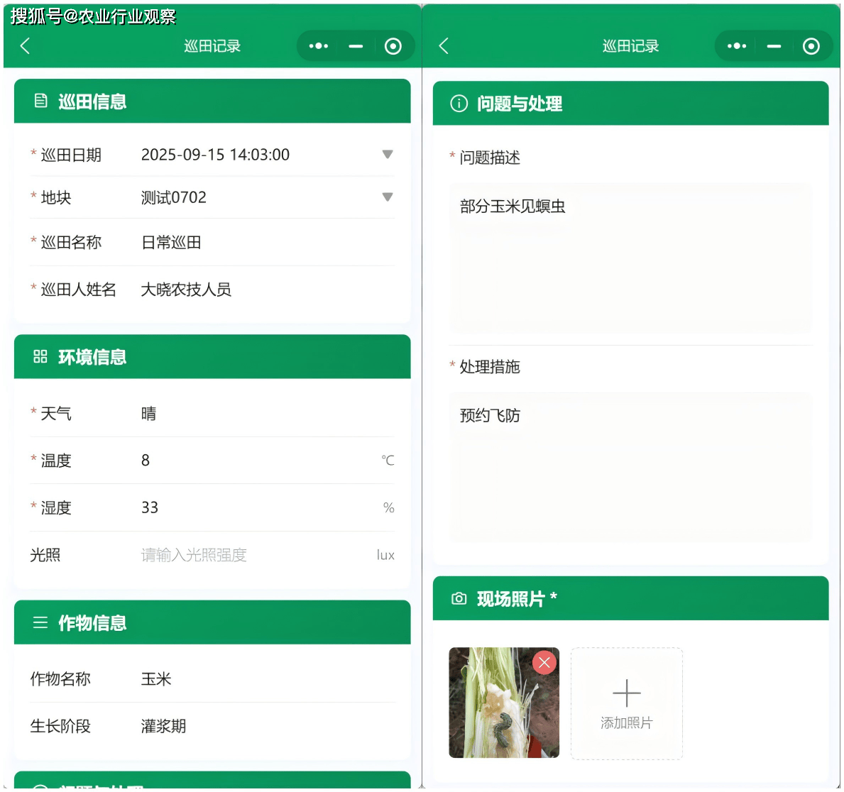 - 智能巡田高效管控:整合巡田人员与巡田无人机的日常管理,实现巡田任务精准分配、轨迹实时追踪,巡田人员上传的现场照片、视频,以及无人机巡田数据,将由平台进行统一AI分析处理,自动生成巡田报告,标注异常区域及处理建议,让巡田效率提升20倍以上,实现“问题早发现、快速能处置”。