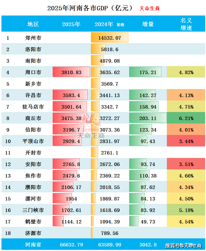 截止1月26日,河南已出12市GDP数据,对比去年GDP初核数据,商丘GDP增量20311亿元和GDP名义增速6.21%均排名全省第一,鹤壁GDP增量49.73亿元排名全省最后,平顶山GDP名义增速3.44%排名全省最后。