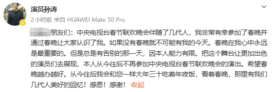 搜狐娱乐讯 26日,孙涛在社交平台发文宣布退出央视春晚舞台。“春晚在我心中永远是最重要的。但是总是有告别的那一天,因本人能力有限。把这个舞台让更加出色的演员们去展现,本人从今往后不再参加中央电视台春节联欢晚会的演出。”据悉,孙涛曾18次登上央视春晚舞台,出演过《上热搜了》《吉祥三保》《军嫂上岛》等小品。