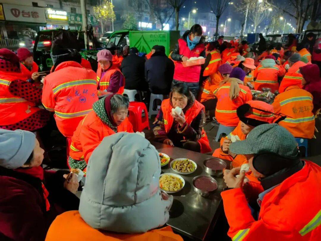 1月26日,卧龙区联舫互助协会、爱心粥志愿团志愿者们为坚守岗位的环卫工人们准备了腊八粥和家常热菜,以传统食俗共度佳节,传递城市温情。