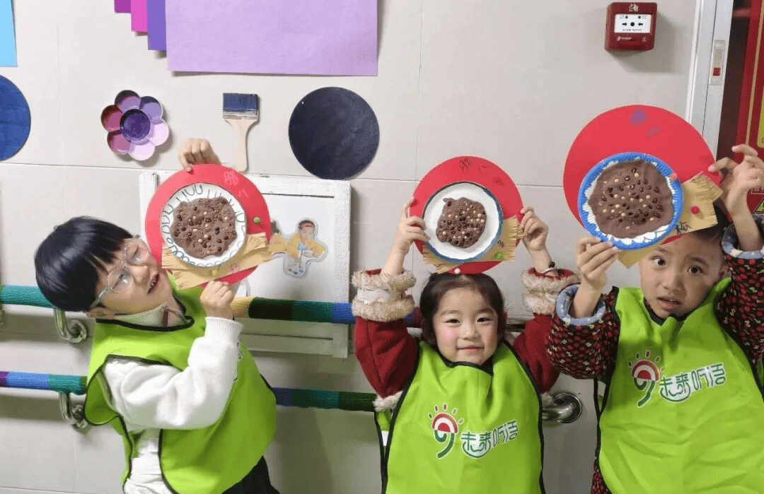 教室里,孩子们化身小小美食家,用粘土和五颜六色的豆子,“熬制”出一碗碗“料超足”的创意腊八粥。红色蜡烛融化成暖暖的蜡液,孩子们将手指在洗洁精水中浸泡后,轻轻点入蜡液再提起——一朵小巧玲珑的红色梅花便瞬间成形!一朵朵梅花寓意着新的一年坚韧与美好。随后,大家用各种杂粮拼贴出 “福” 字,金黄的玉米粒、饱满的红豆、雪白的大米在纸上组合成喜庆的图案,孩子们看着自己的作品,脸上都露出了自豪的笑容。