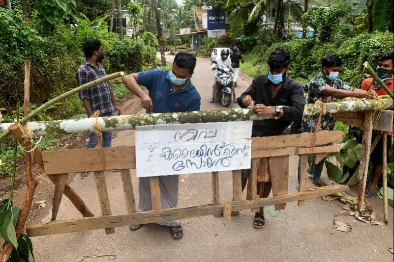 2023年9月13日,在印度南部喀拉拉邦科泽科德地区,人们设置路障以遏制尼帕病毒传播。 孟加拉国、印度、马来西亚等几个国家几乎每年都会发现少量病例。新华社/路透