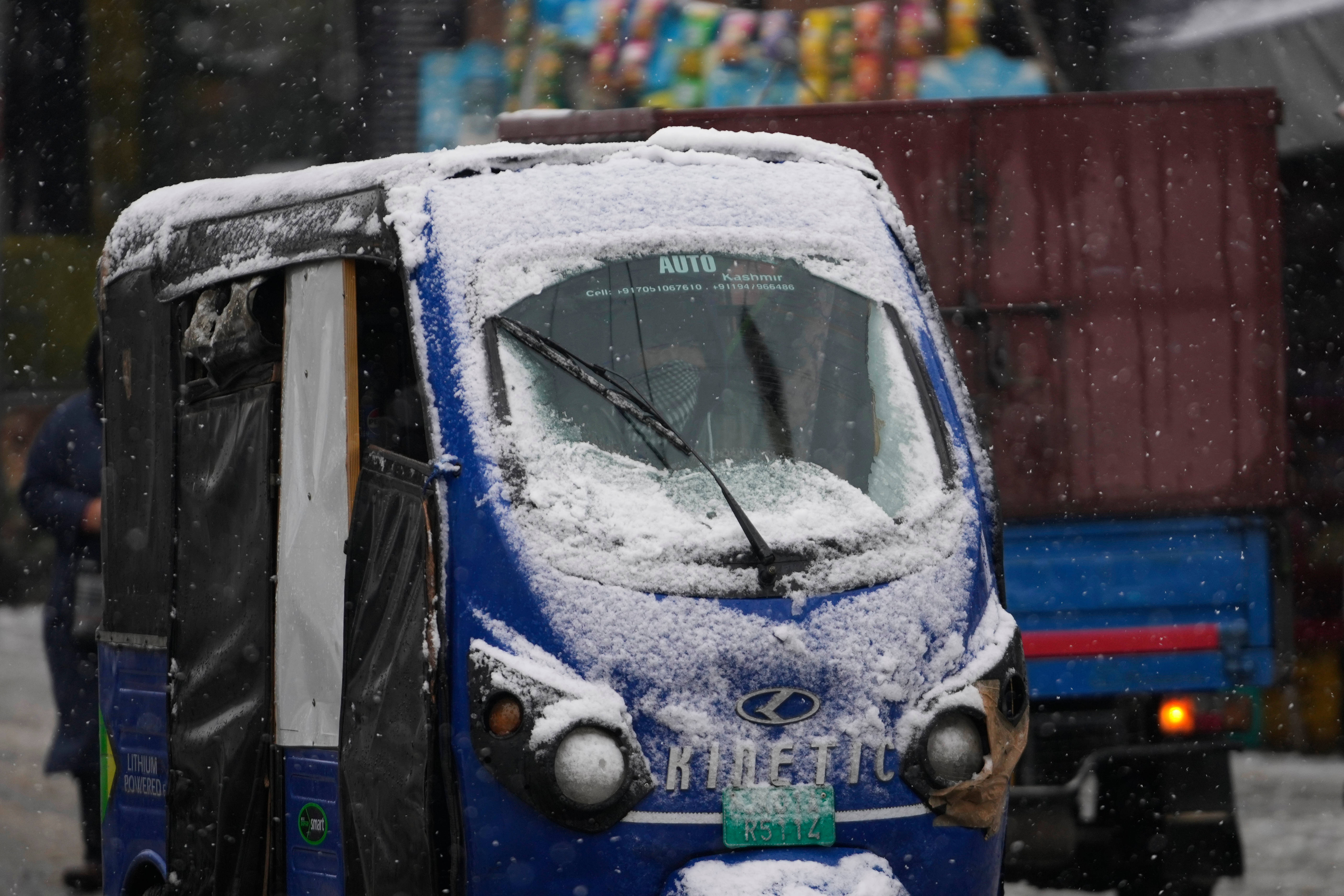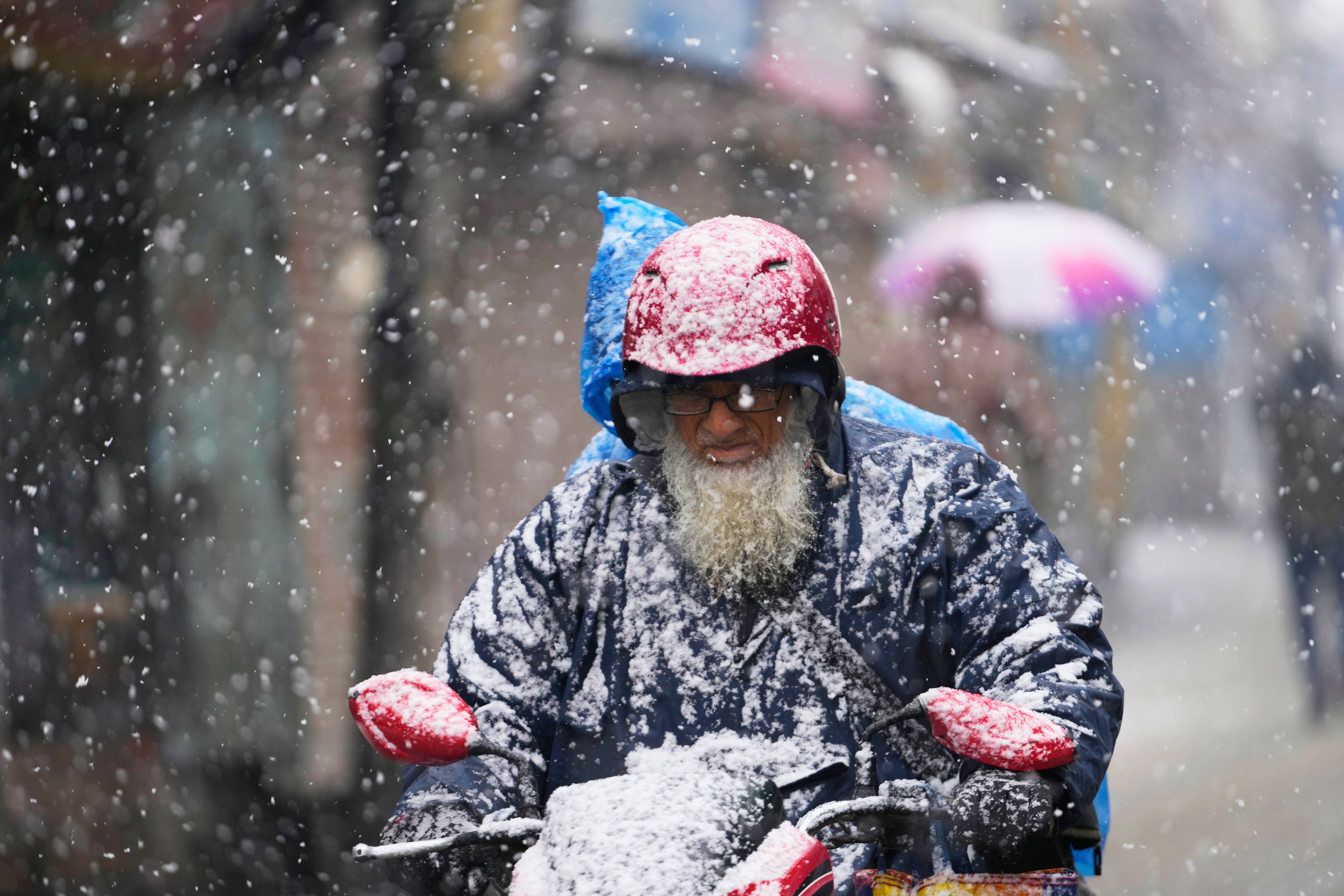 1月27日,在印控克什米尔首府斯利那加,一名男子冒雪出行。 新华社/美联