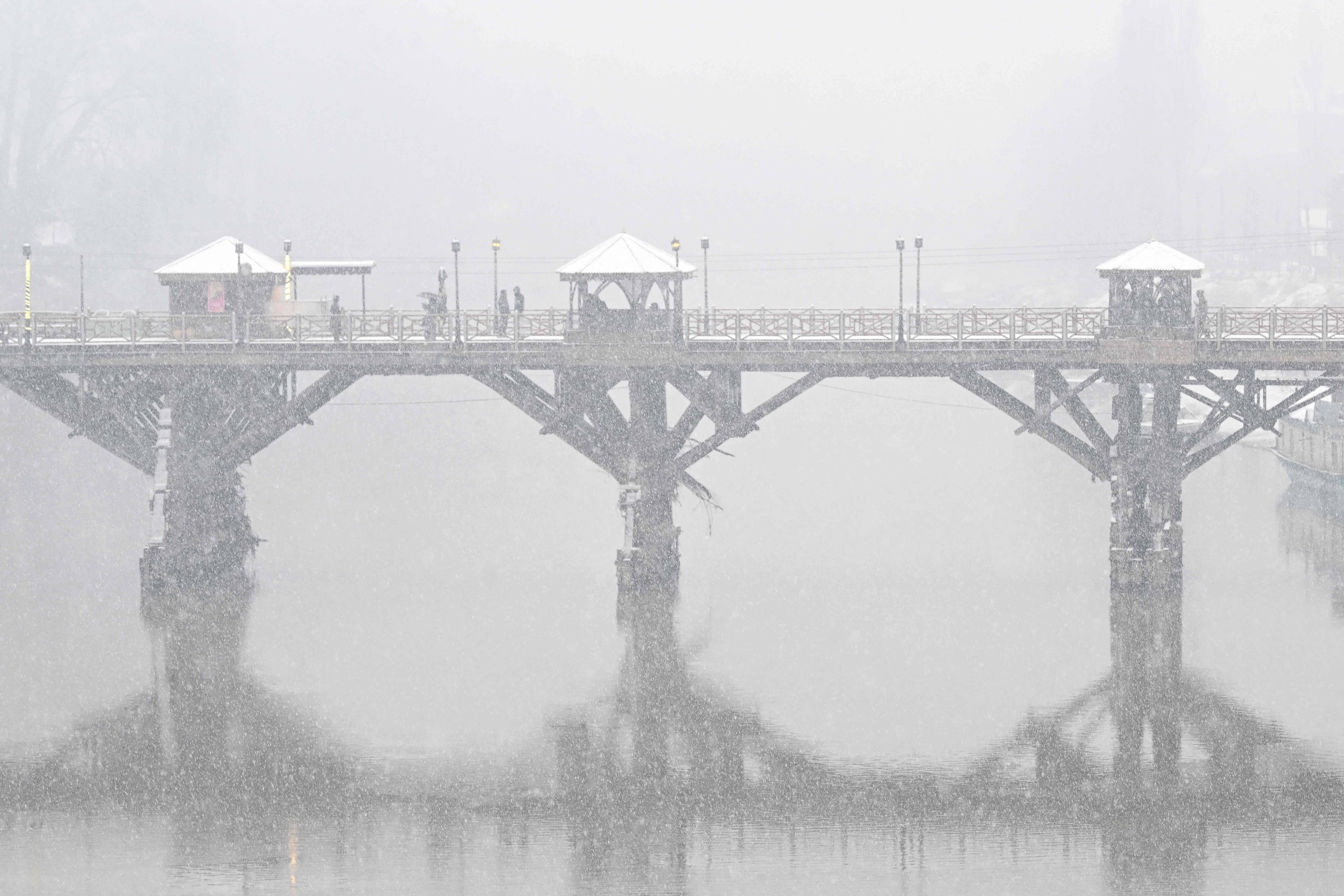 这是1月27日在印控克什米尔首府斯利那加拍摄的雪中的一座桥。 新华社/法新
