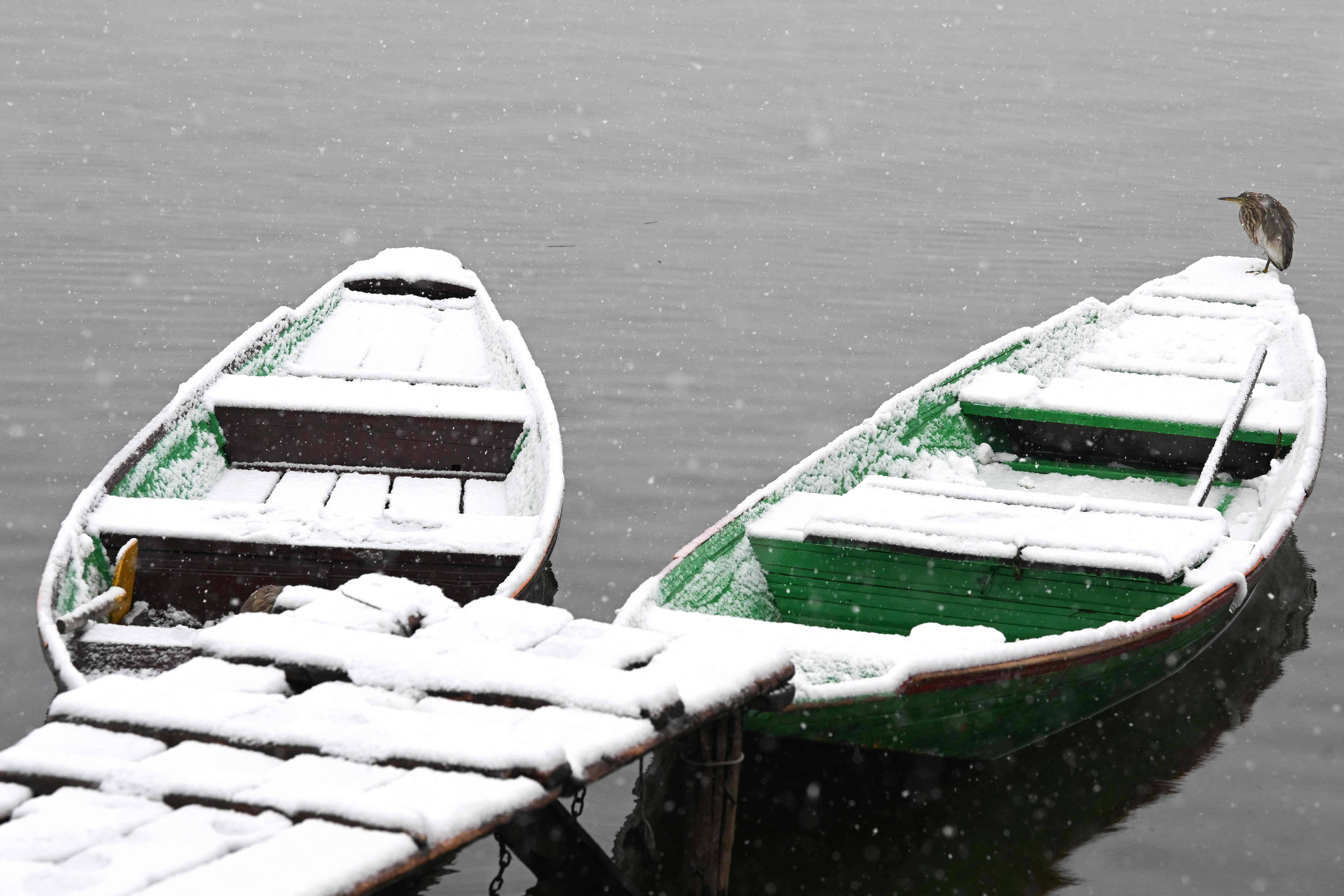1月27日,在印控克什米尔首府斯利那加,停泊在湖边的船被积雪覆盖。 新华社/法新