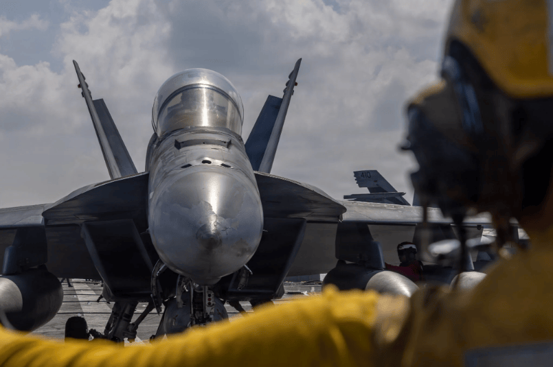 1月23日,美国海军航空兵在航空母舰“亚伯拉罕·林肯”号飞行甲板上指挥F/A-18F“超级大黄蜂”战斗机。(图片来自美国海军学会新闻网)