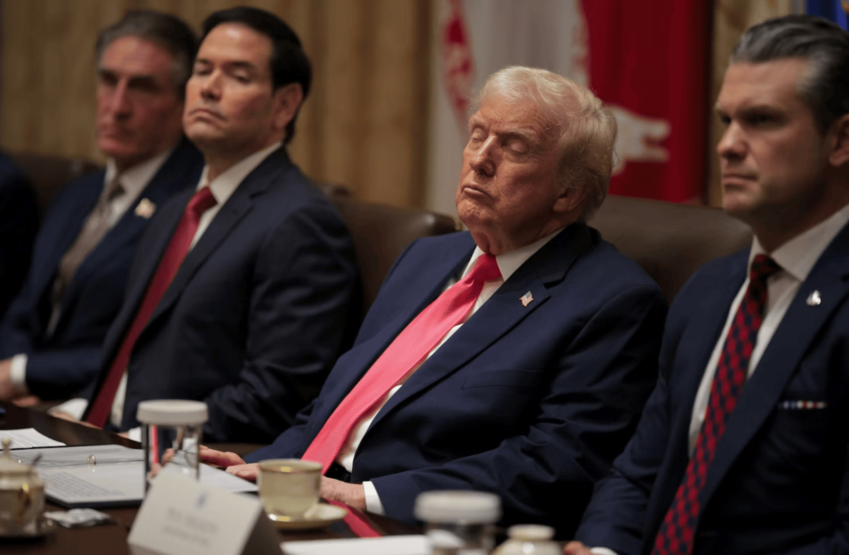 在2024年美国大选竞选期间,特朗普一直嘲讽前任总统拜登是“瞌睡乔”,他还自诩“精力旺盛到不需要睡眠”。不过,近日一张特朗普在内阁会议上闭目养神的照片在社交媒体上疯传。画面中,特朗普深深地陷在皮椅里,在国务卿鲁比奥、国防部长海格塞斯、商务部长卢特尼克等人的环绕下,他闭着眼睛,不知道是在睡觉还是在养神。