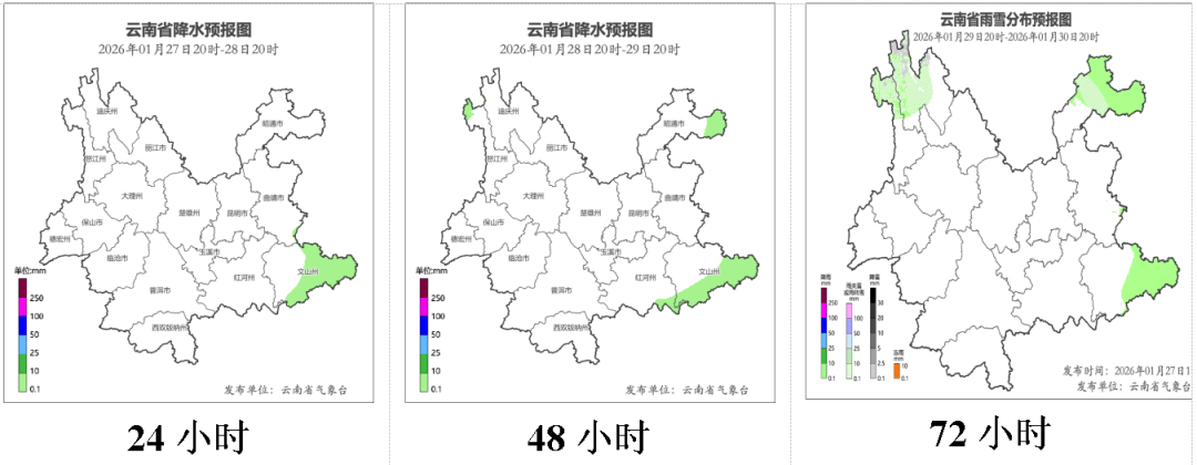 2026年1月27日20时至2026年1月28日20时,迪庆州、怒江州、丽江市、大理州、保山市、临沧市北部、楚雄州、昆明市、玉溪市、红河州北部、昭通市西南部、曲靖市北部二级,德宏州、临沧市南部、普洱市、西双版纳州、红河州中部、昭通市中部、曲靖市中东部、文山州西北部三级,其他地区四级。